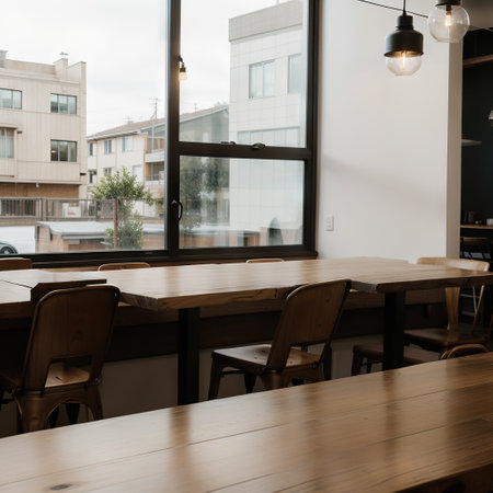 Discover a cozy cafe interior featuring wooden tables and chairs, adorned with lush green plants, creating a warm and inviting atmosphere perfect for relaxation and enjoyment.