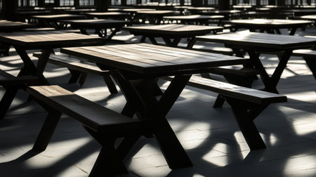 Empty Wooden Picnic Tables Sunlight Shadows Outdoor Setting day park dark grey cafe calm view bench