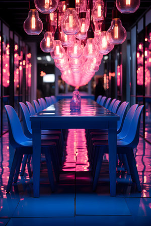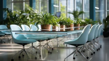 Modern conference room with sleek chairs and a wooden table, featuring a graph board in a bright office. A cozy environment for negotiations and business meetings. Open space.