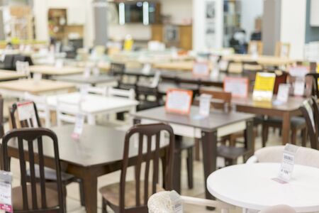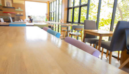 Selective focus with perspective view of long wooden table near window and blurred people background in relaxing atmosphere for business, working or meeting in shows beautiful for background.