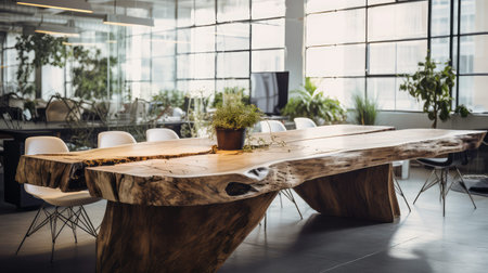 Explore this modern office setting showcasing a stylish wooden table, vibrant plants, organized papers, and technology, ideal for creative projects and collaboration.