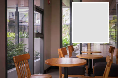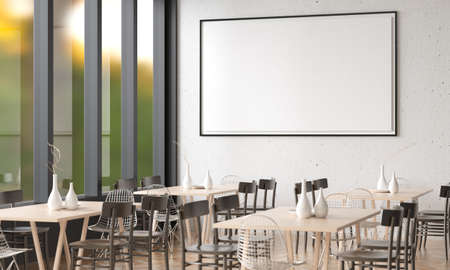 Cafe or restaurant interior with blank horizontal poster on the white brick wall. Front view. Clipping path around poster mock up. 3d illustration.