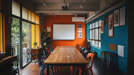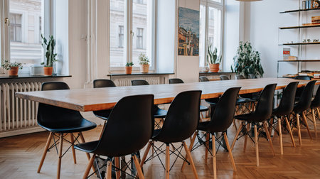 A well-lit, interior view of a conference room showcases a long wooden table surrounded by black chairs. Natural light streams through large windows, highlighting the room's minimalist design. The composition suggests a space for collaboration, presentations, or gatherings suitable for various commercial uses.