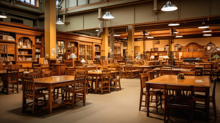 Wide shot of a large library with long tables and chairs. The tables are light brown wood and the chairs are a teal and dark gray. The space is well-lit and airy.