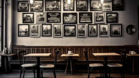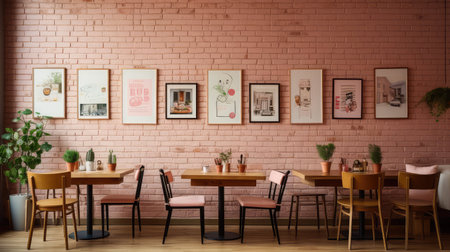 A cozy modern restaurant interior featuring wooden tables, stylish chairs, and a large empty frame on the wall, perfect for showcasing artwork.