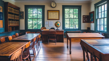A beautifully preserved vintage classroom featuring wooden furniture, natural light, and educational elements like a globe, creating a nostalgic atmosphere for learning.
