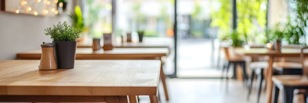 Coworking space with empty wooden table, a potted plant and a cafe area in background