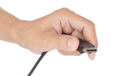 a black hdmi cable is clutched in the man's hand. cable to connect the home media
