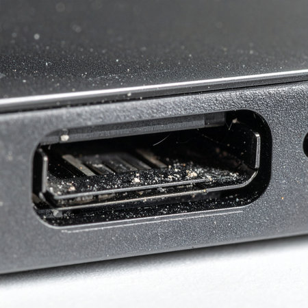 A detailed macro photograph reveals a common but overlooked issue: a USB-C charging port clogged with dust, lint, and debris.