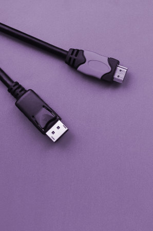 Audio video HDMI computer cable plug and 20-pin male DisplayPort gold plated connector for a flawless connection on a purple background