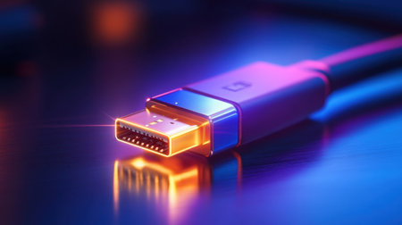 This image showcases a close-up view of a USB cable securely connected to an electronic device's port, surrounded by colorful neon lighting.