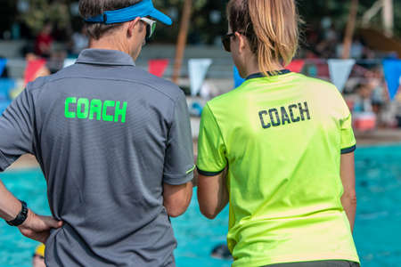 Back view of male and female swimming coaches, wearing COACH shirt, working together at an outdoor swimming pool