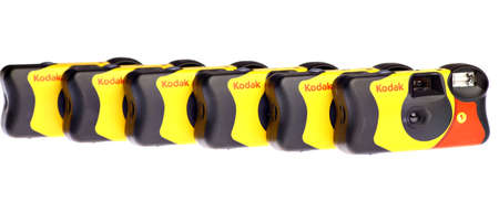 Bucharest, Romania - July 23, 2013: Picture of some disposable Kodak compact cameras. The one-time-use camera was pioneered by Kodak, an American multinational imaging and photographic equipment, materials and services company.
