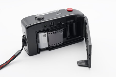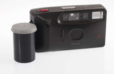 film cassette and compact old analog camera on a white background focus on a roll of photographic film