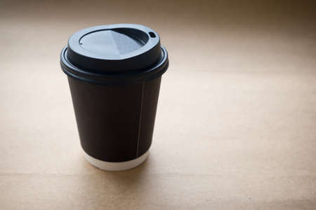Blank black disposable paper cup on brown background
