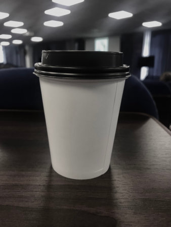 Paper coffee cup on white table in office