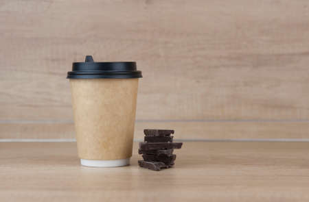 Coffee paper craft cup stands on wooden surface on a blurred background. Place for text