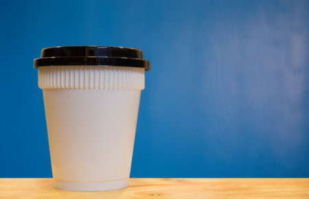paper coffee cups of wood background blue