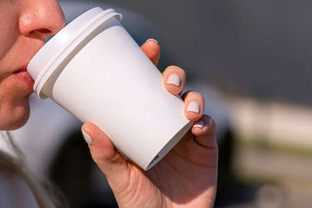 A woman holding white paper cup with beverage coffee or tea in the morning in a city street, white blank cardboard mug