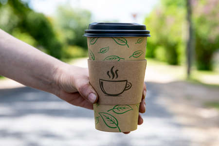 Drink coffee in nature from an ecological paper cup