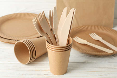 eco friendly disposable dishes made paper on white marble background. Draped spoons, fork, knives, plate with paper cups. recycling concept