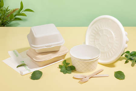 Eco friendly biodegradable paper disposable for packaging food on wooden background.