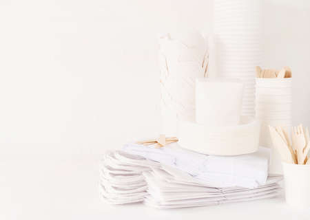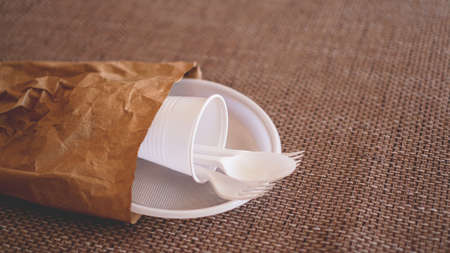 White plastic dishes in a paper packet on beige background. Concept of Recycling plastic and ecology