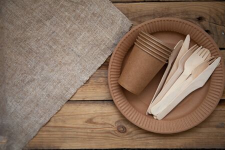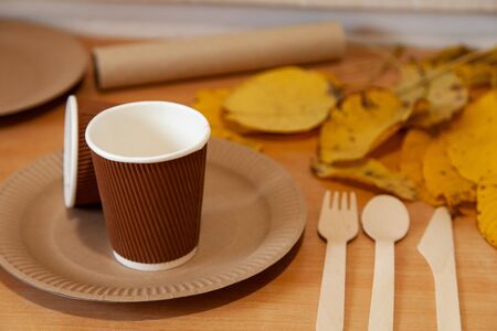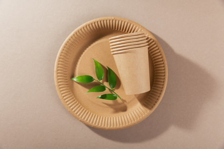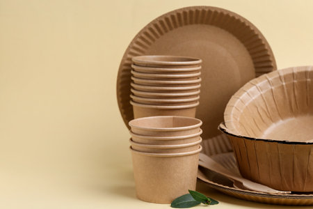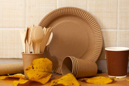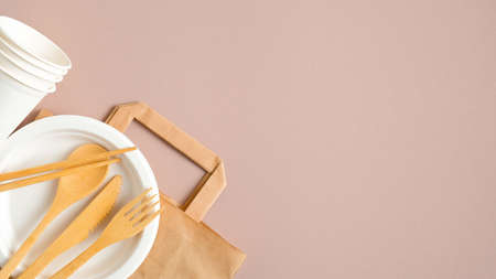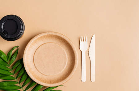 disposable paper and wood biodegradable tableware on a beige background, eco friendly lifestyle concept