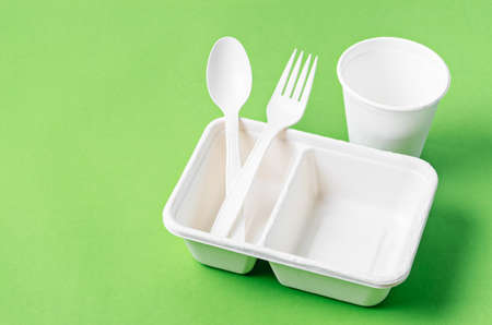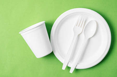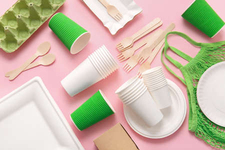 Eco-friendly disposable dishware and bamboo utensils over green background. Paper and cornstarch cases, cups, packets and dishes. Top view.