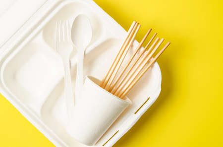 Eco friendly biodegradable paper disposable for packaging food and paper glass on yellow background.