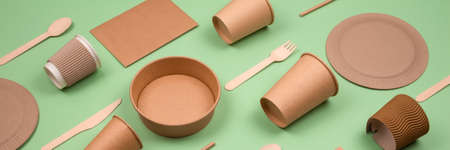Wooden forks and paper cups with plates on green background. Eco friendly disposable tableware. Used in fast food, restaurants, takeaways, picnics. No plastic zero waste