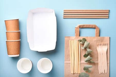 Paper cups, dishes, bag, wooden forks, drinking straws, fast food containers, wooden cutlery on light blue background. Eco craft paper tableware. Recycling and food delivery concept. Mock up. Top view