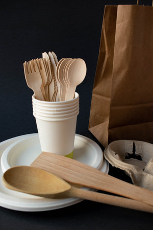 Various paper tableware and utensils - paper cups, containers, bags and wooden bamboo cutlery over dark gray concrete background with copy space. Sustainable food packaging concept