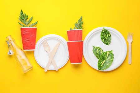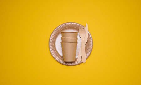white paper cups and plates on a yellow background. Recyclable garbage, rejection of plastic, top view
