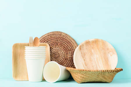 disposable paper and wood biodegradable tableware on a blue background, eco friendly lifestyle concept