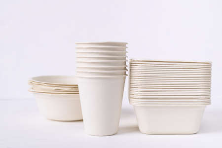 Biodegradable bowl and cup made from natural fiber on white background, Eco friendly and sustainability concept