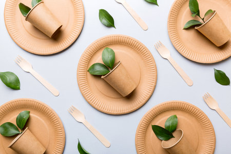 Zero waste, environmentally friendly, disposable, cardboard, paper tableware. View from the top.