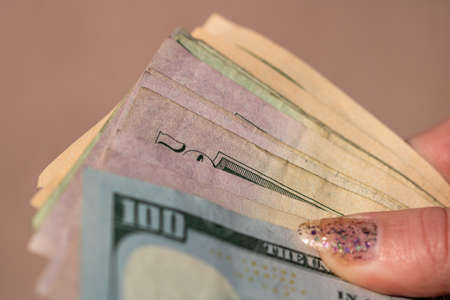 A Wad of hundred dollar bills in female hand. Selective focus