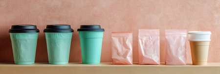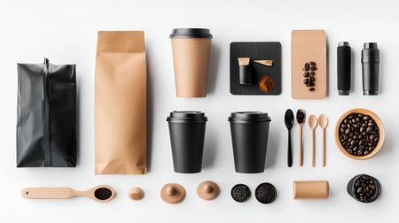 Coffee branding set including a premium coffee cup, packaging, and accessories, all displayed on a pristine white background