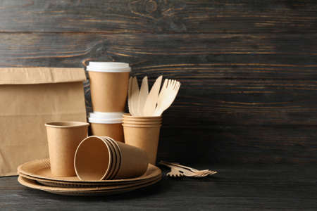 Eco - friendly tableware and paper bag on wooden table, copy space