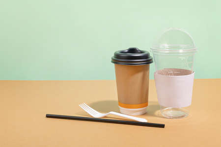protect earth and environment concept, paper cups and plastic cups plastic fork and straw
