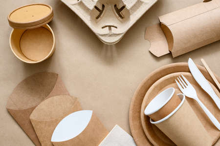 Eco friendly, disposable, recyclable, compostable tableware. Paper food boxes, dishes on light background. Sustainable lifestyle and PLASTIC FREE concept. Flat lay Earth tones with place for text