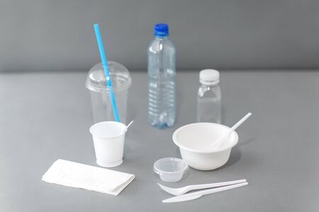 eating, recycling and ecology concept - disposable plastic dishes on grey background