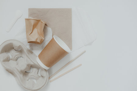 Eco-friendly paper tableware. Dishes, paper cups, fast food containers and cutlery. Recycling or environmentally friendly concept. Zero waste concept