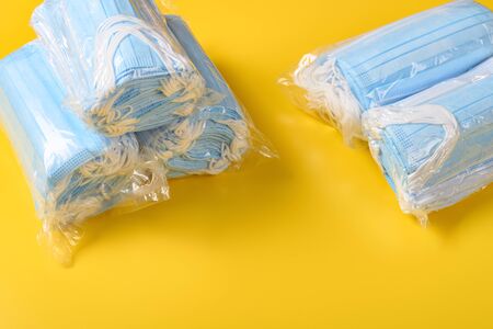 packs of medical face masks on a yellow background