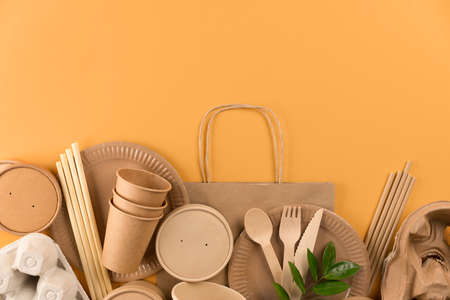 Top view on eco-friendly tableware set - kraft paper food packaging, paper containers and cups, drinking straws on orange background with copy space. Street food recycled paper packaging concept