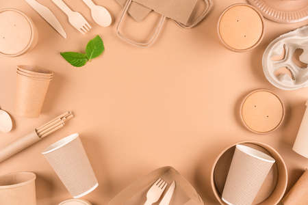 Eco-friendly disposable tableware on pastel beige background