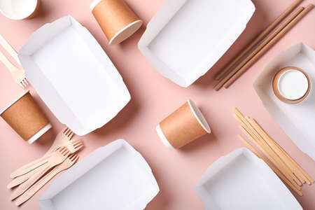 Paper cups, dishes, bag, wooden forks, drinking straws, fast food containers, wooden cutlery on pink background. Eco craft paper tableware. Recycling and food delivery concept. Mock up. Top view