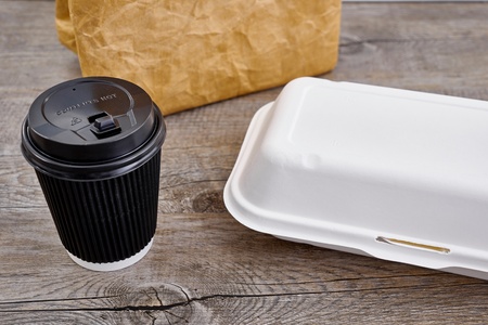 disposable fork with knife, paper coffee cup, food boxes and chopsticks on white