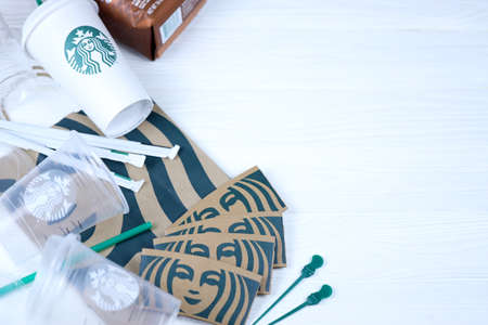 KHARKOV, UKRAINE - MARCH 15, 2021: Starbucks production on white wooden table. Starbucks Corporation is multinational chain of coffeehouses and roastery reserves headquartered in Seattle, Washington